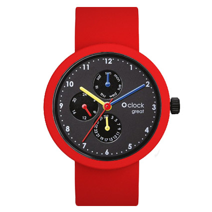 Rood met zwart en kleuraccenten. Wijzers: Blauw, geel en rood.