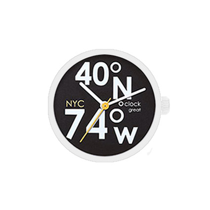 Wit en zwart met kleuraccent. De wijzers in wit en oranje.