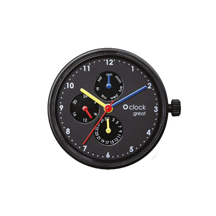 Zwart met kleuraccent. De wijzers in blauw, rood en geel.