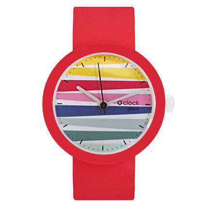 Daar word je toch vrolijk van! De wijzerplaat met speelse horizontale mulicolour strepen.