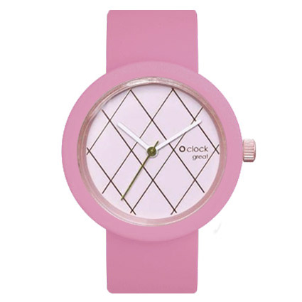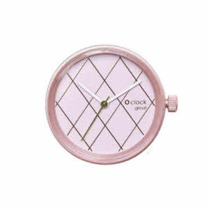 Zachtroze met fraai goudkleurig ruitpatroon op de wijzerplaat. Wijzers: wit. Secondewijzer: goud. Bandje: Roze.
