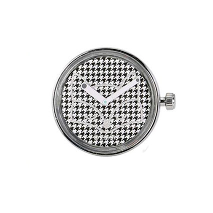 Fraai eigentijds glimmend O clock uurwerk in zilver met Pied de Poule patroon en een gestileerde vos op de wijzerplaat.