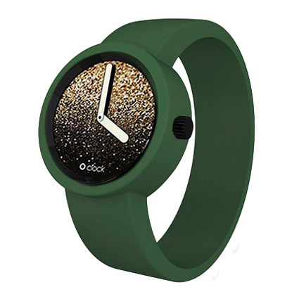 Zwart met van zwart naar gouden glinsterende wijzerplaat. Bandje: Donkergroen.