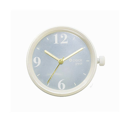 Parelmoer wit met een spiegelende wijzerplaat. Goudkleurige wijzers.